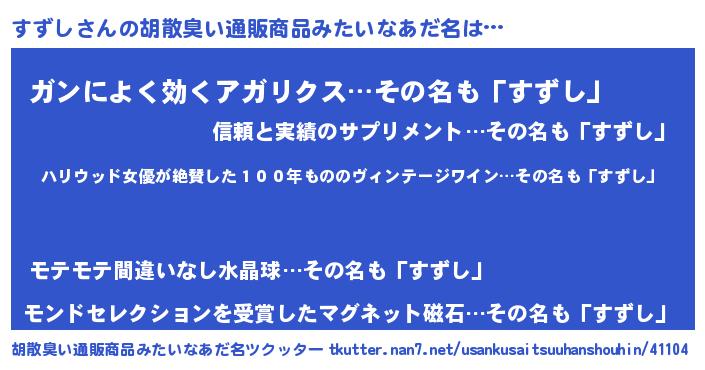 | 意味不明あだ名 | 『住所不定無職すずし(2歳)』『自称すずし』 |