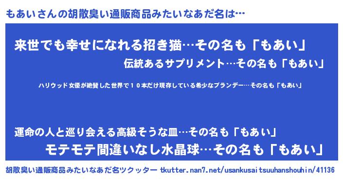 | ヘコむあだ名 | 『もあい(震え声)』『もあにー』 |