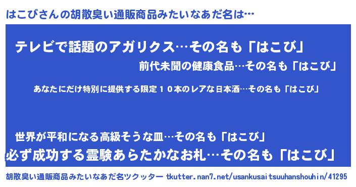 | 意味不明あだ名 | 『住所不定無職はこび(41歳)』『自称はこび』 |