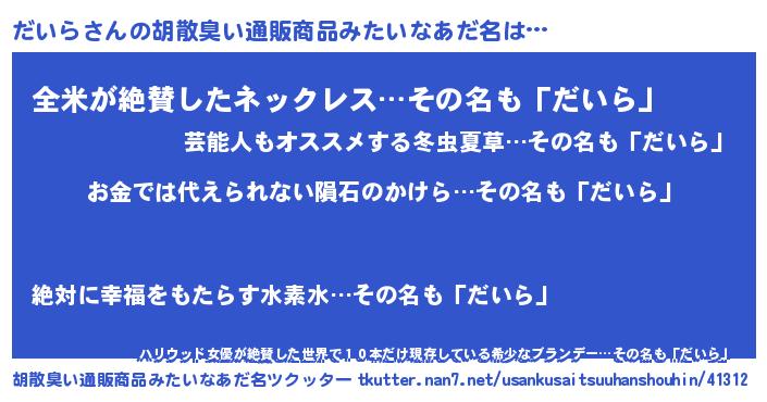 | ヘコむあだ名 | 『だいぷりん』『だいら(爆)』『豆乳』 |