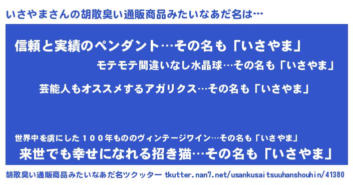 | 男性向けラノベタイトル風あだ名 | 『いさやま~年齢イコール彼女いない歴の魔法使い~』 |