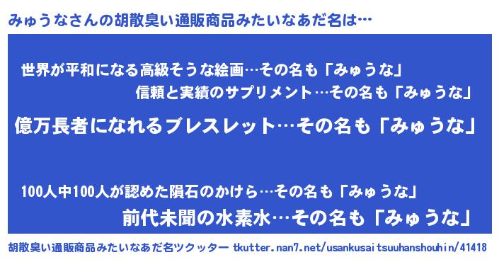 | 意味不明あだ名 | 『ペロリンみゅうな』『永久保存みゅうな』 |