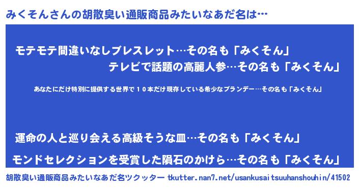 | 意味不明あだ名 | 『住所不定無職みくそん(93歳)』 |