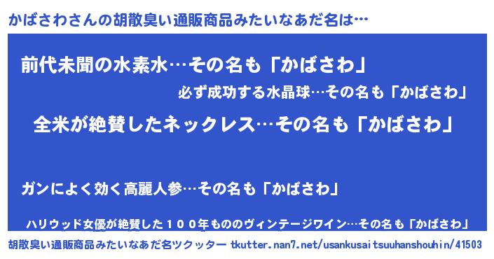 | 男性向けラノベタイトル風あだ名 | 『かばさわ~年齢イコール彼女いない歴の魔法使い~』 |