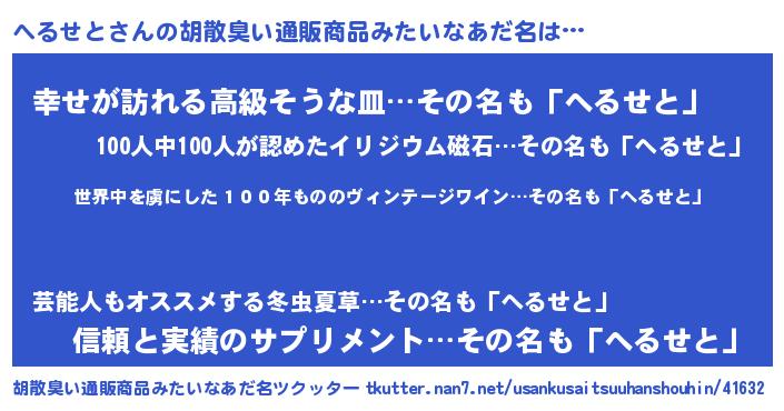 | 意味不明あだ名 | 『住所不定無職へるせと(6歳)』 |