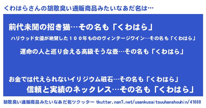 | 男性向けラノベタイトル風あだ名 | 『くわはら~年齢イコール彼女いない歴の魔法使い~』 |
