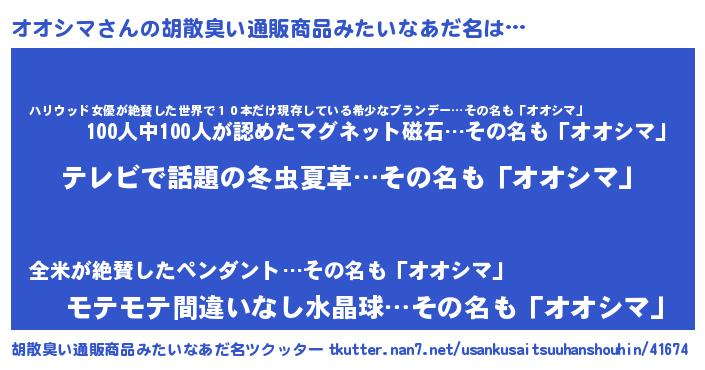 | 男性向けラノベタイトル風あだ名 | 『転生したらオオシマだった件』 |