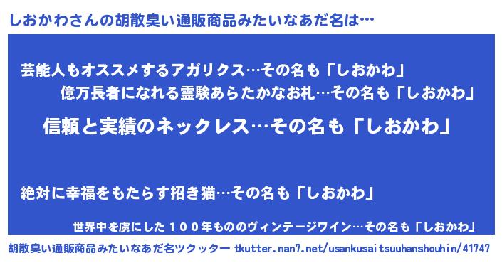 | 意味不明あだ名 | 『とにかく怪しいしおかわ』 |
