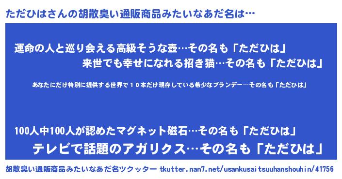 | 男性向けラノベタイトル風あだ名 | 『この素晴らしい世界にただひはを!』 |