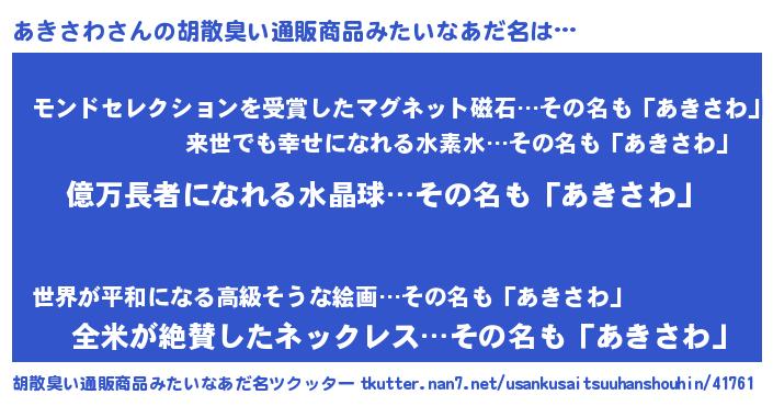 | ヘコむあだ名 | 『あきにゅー』『あき太郎』『豆乳』 |