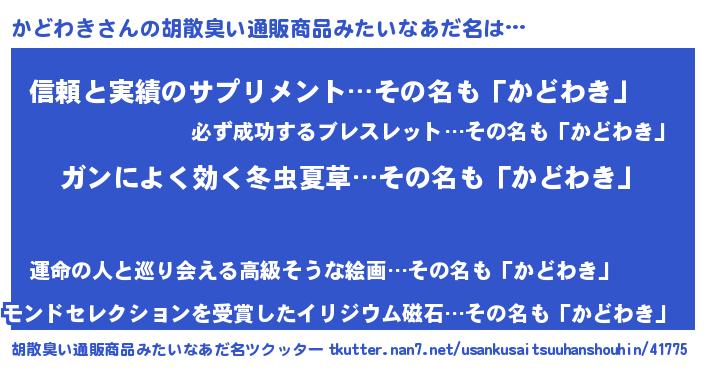| 恥ずかしいあだ名 | 『カドワキデラックス』『カドリンリン』 |