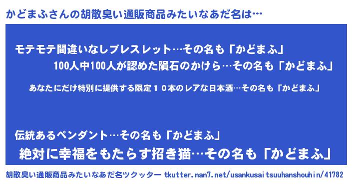 | ヘコむあだ名 | 『かどもー』『かどまふ(笑)』『牛乳』 |