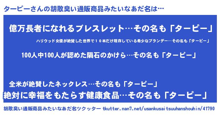 | ヘコむあだ名 | 『ターっふぃ~』『ターピー(小並感)』 |