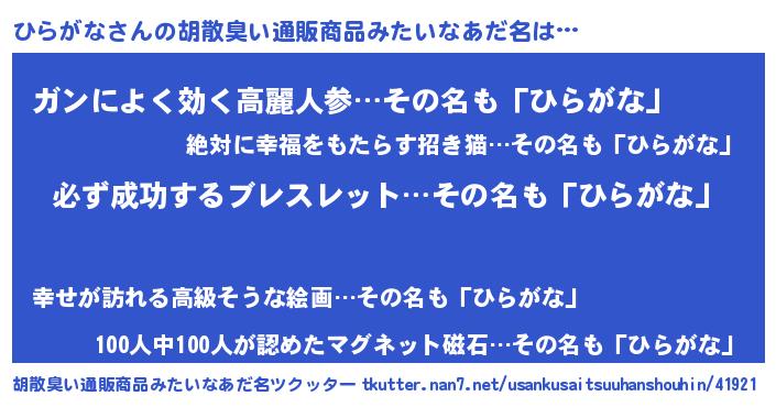 | 男性向けラノベタイトル風あだ名 | 『ヒラガナスレイヤー』 |