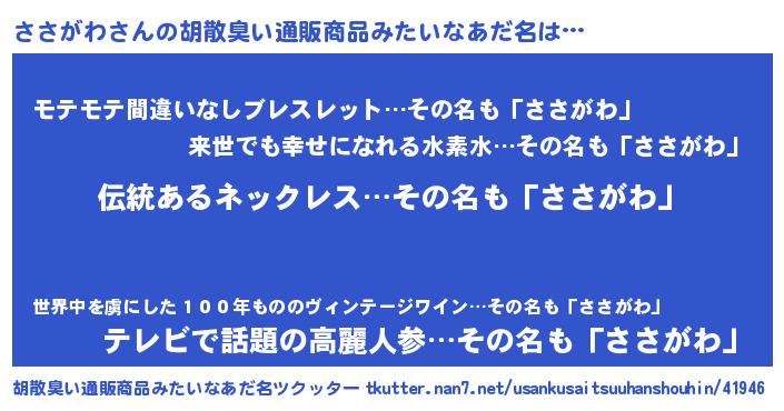 | 男性向けラノベタイトル風あだ名 | 『ささがわに滅ぼされるだけの簡単なお仕事です』 |
