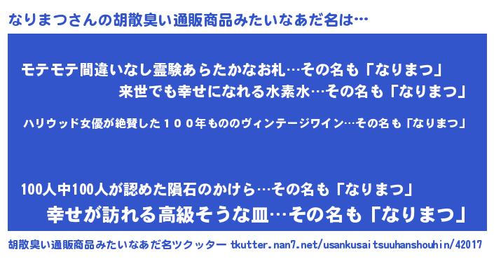 | 男性向けラノベタイトル風あだ名 | 『魔弾の王となりまつ』『なりまつの憂鬱』 |