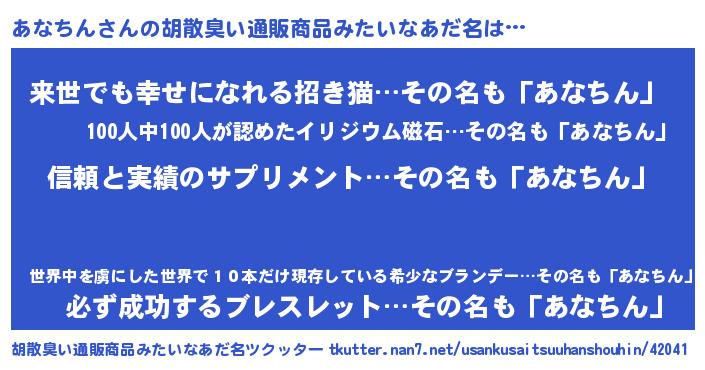 | 男性向けラノベタイトル風あだ名 | 『ダンジョンにあなちんを求めるのは間違っているだろうか』 |