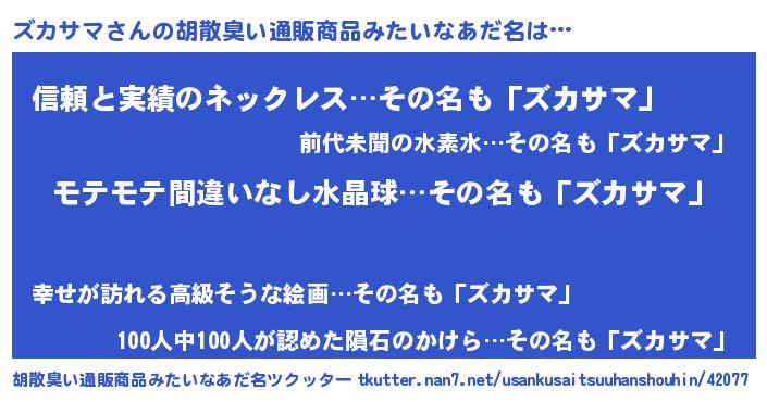 | 男性向けラノベタイトル風あだ名 | 『ズカサマに滅ぼされるだけの簡単なお仕事です』 |
