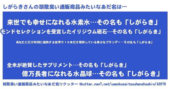 | 男性向けラノベタイトル風あだ名 | 『この素晴らしい世界にしがらきを!』 |