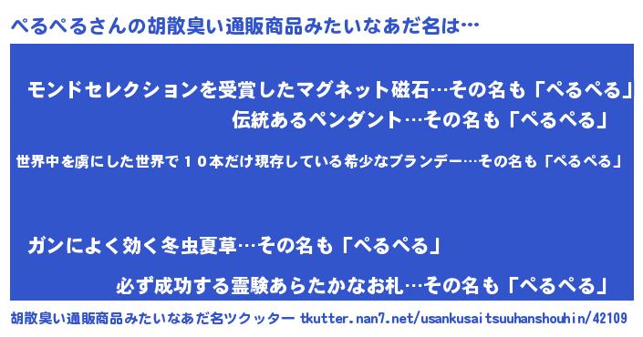 | 男性向けラノベタイトル風あだ名 | 『魔弾の王とぺるぺる』『ぺるぺるの憂鬱』 |