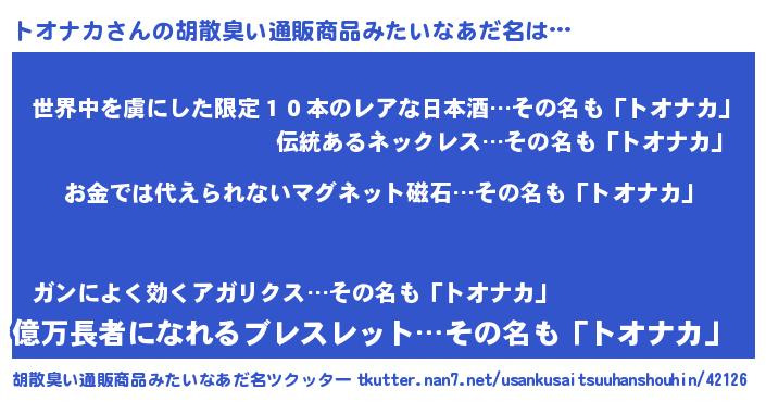 | 男性向けラノベタイトル風あだ名 | 『転生したらトオナカだった件』 |