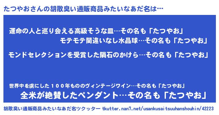 | ヒーロー風カッコイイあだ名 | 『天空の使者たつやお』『幻影騎士タツ』 |