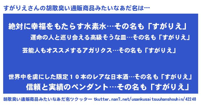 | 意味不明あだ名 | 『自称すがりえ』『永久保存すがりえ』 |