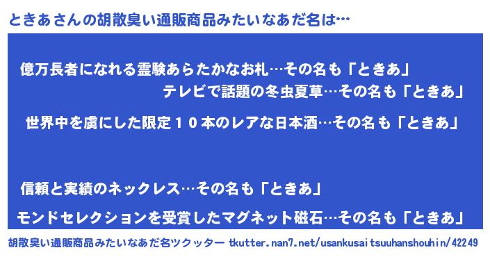 | ヘコむあだ名 | 『ときにゅー』『ときを』『酢こんぶ』 |