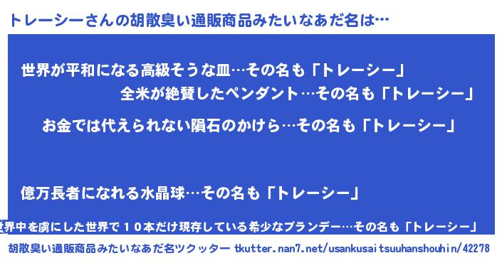 | 男性向けラノベタイトル風あだ名 | 『トレーシーに滅ぼされるだけの簡単なお仕事です』 |