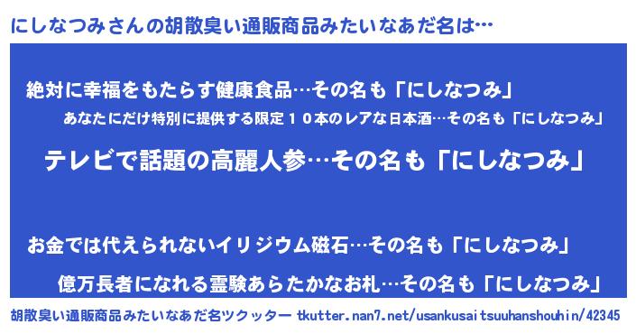| 意味不明あだ名 | 『自称にしなつみ』『永久保存にしなつみ』 |