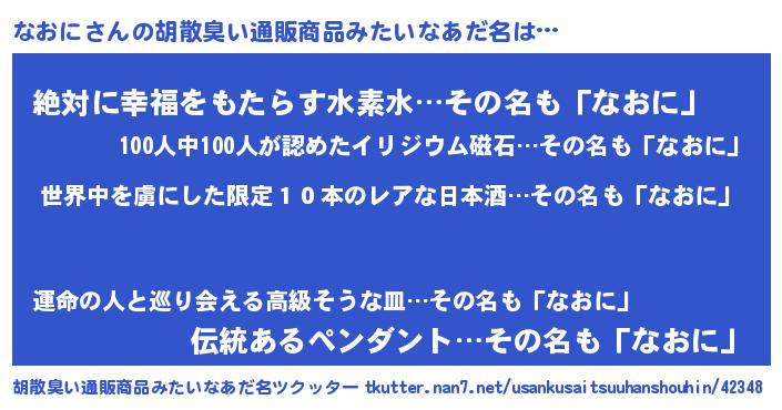 | 男性向けラノベタイトル風あだ名 | 『なおにに滅ぼされるだけの簡単なお仕事です』 |