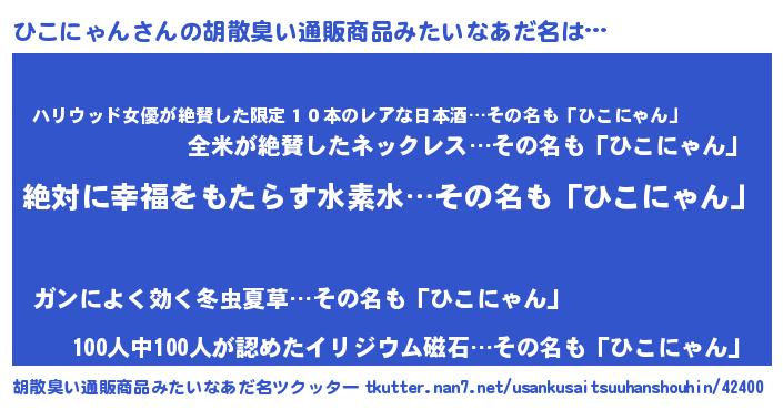 | 男性向けラノベタイトル風あだ名 | 『ひこにゃんという概念が存在しない退屈な世界 』 |