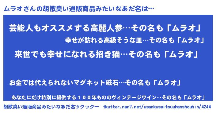 | 意味不明あだ名 | 『永久保存ムラオ』『自称ムラオ』 |