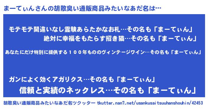 | 男性向けラノベタイトル風あだ名 | 『この素晴らしい世界にまーてぃんを!』 |