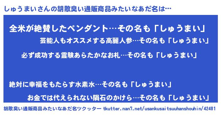 | 意味不明あだ名 | 『ペロリンしゅうまい』『自称しゅうまい』 |