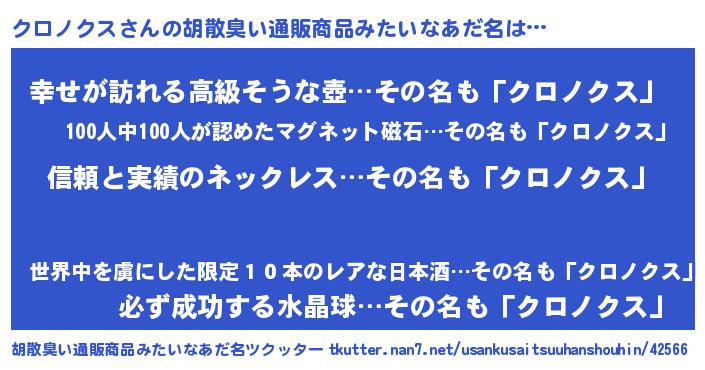| 男性向けラノベタイトル風あだ名 | 『ダンジョンにクロノクスを求めるのは間違っているだろうか』 |