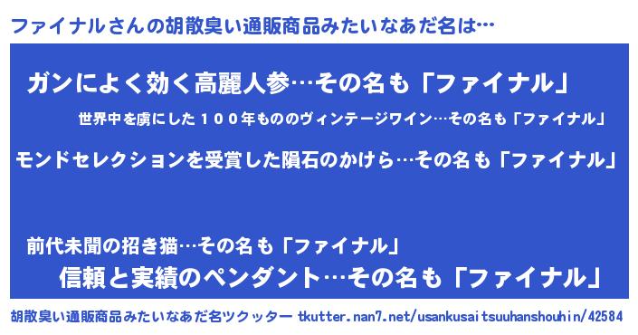 | 男性向けラノベタイトル風あだ名 | 『ファイナルに滅ぼされるだけの簡単なお仕事です』 |