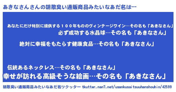 | 男性向けラノベタイトル風あだ名 | 『あきなさんという概念が存在しない退屈な世界 』 |