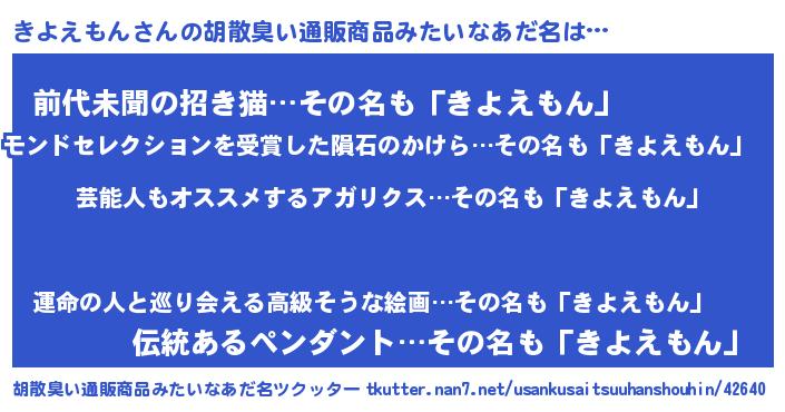 | 男性向けラノベタイトル風あだ名 | 『Re:きよえもんから始める異世界生活』 |