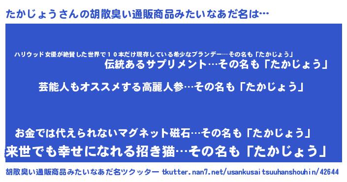 | 意味不明あだ名 | 『自称たかじょう』『永久保存たかじょう』 |