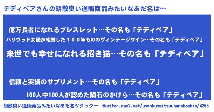 | 男性向けラノベタイトル風あだ名 | 『転生したらテディベアだった件』 |