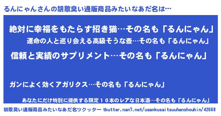 | ヘコむあだ名 | 『るんお』『るんにゃん(小並感)』 |