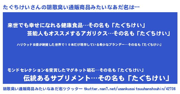 | ヘコむあだ名 | 『たぐちけい(苦笑)』『たぐっぺ』 |