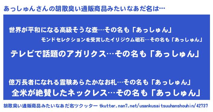 | 男性向けラノベタイトル風あだ名 | 『Re:あっしゅんから始める異世界生活』 |