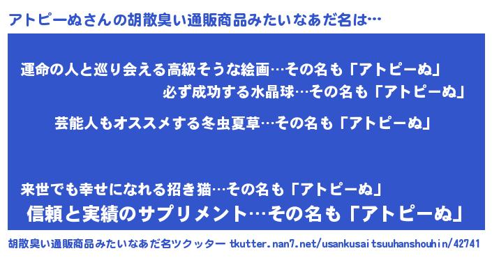 | ファンタジー風あだ名 | 『ゼアトトゥ』『エターナルアトピーヌー』 |