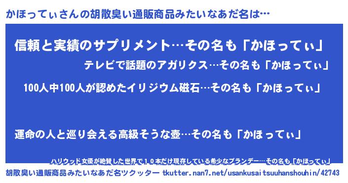 | 男性向けラノベタイトル風あだ名 | 『おまえをオタクにしてやるから、俺をかほってぃにしてくれ! 』 |