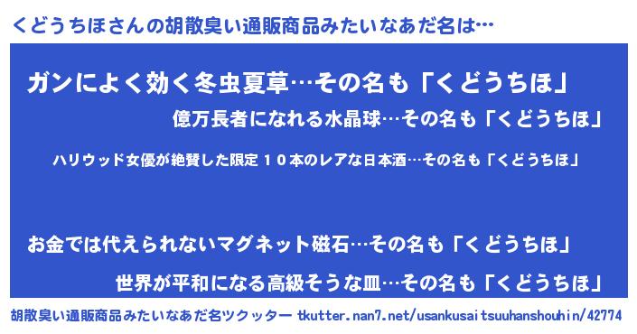 | 意味不明あだ名 | 『住所不定無職くどうちほ(39歳)』 |