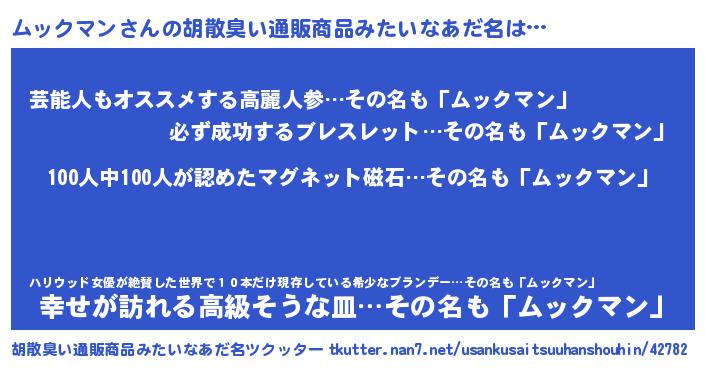 | 男性向けラノベタイトル風あだ名 | 『おまえをオタクにしてやるから、俺をムックマンにしてくれ! 』 |