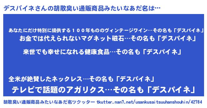 | 男性向けラノベタイトル風あだ名 | 『デスパイネという概念が存在しない退屈な世界 』 |