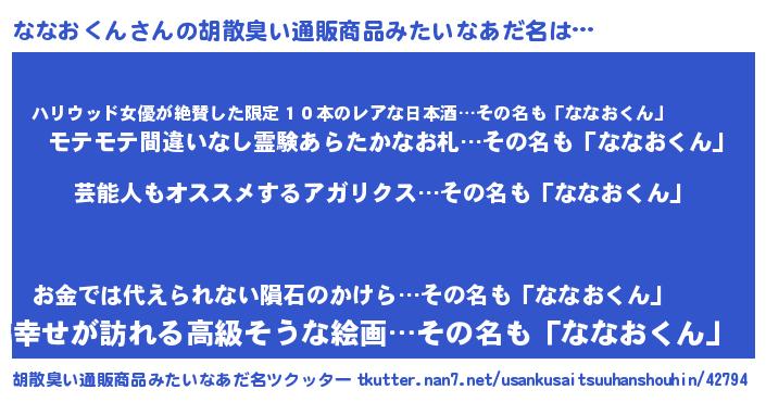 | 男性向けラノベタイトル風あだ名 | 『Re:ななおくんから始める異世界生活』 |